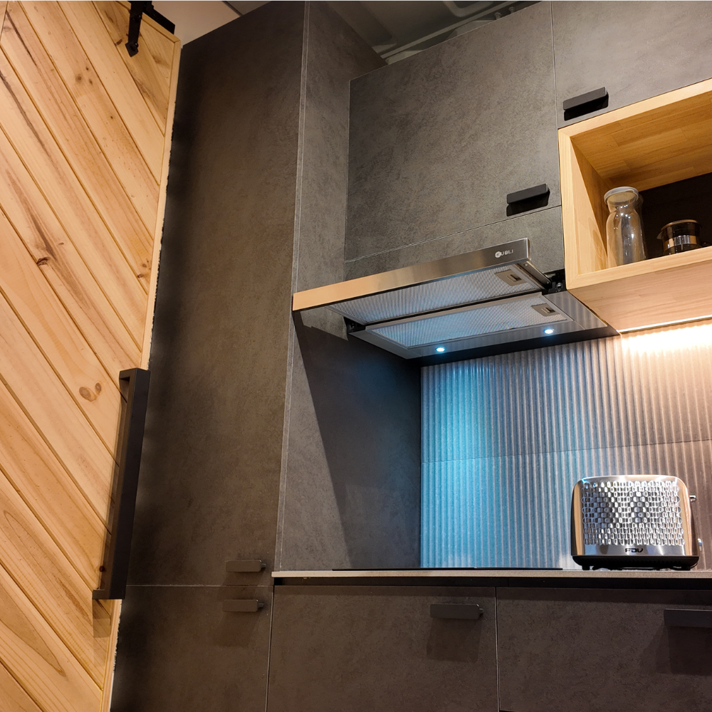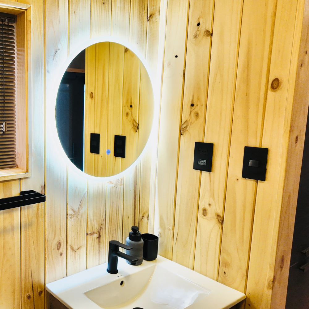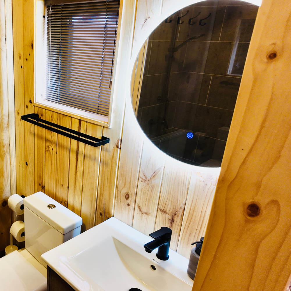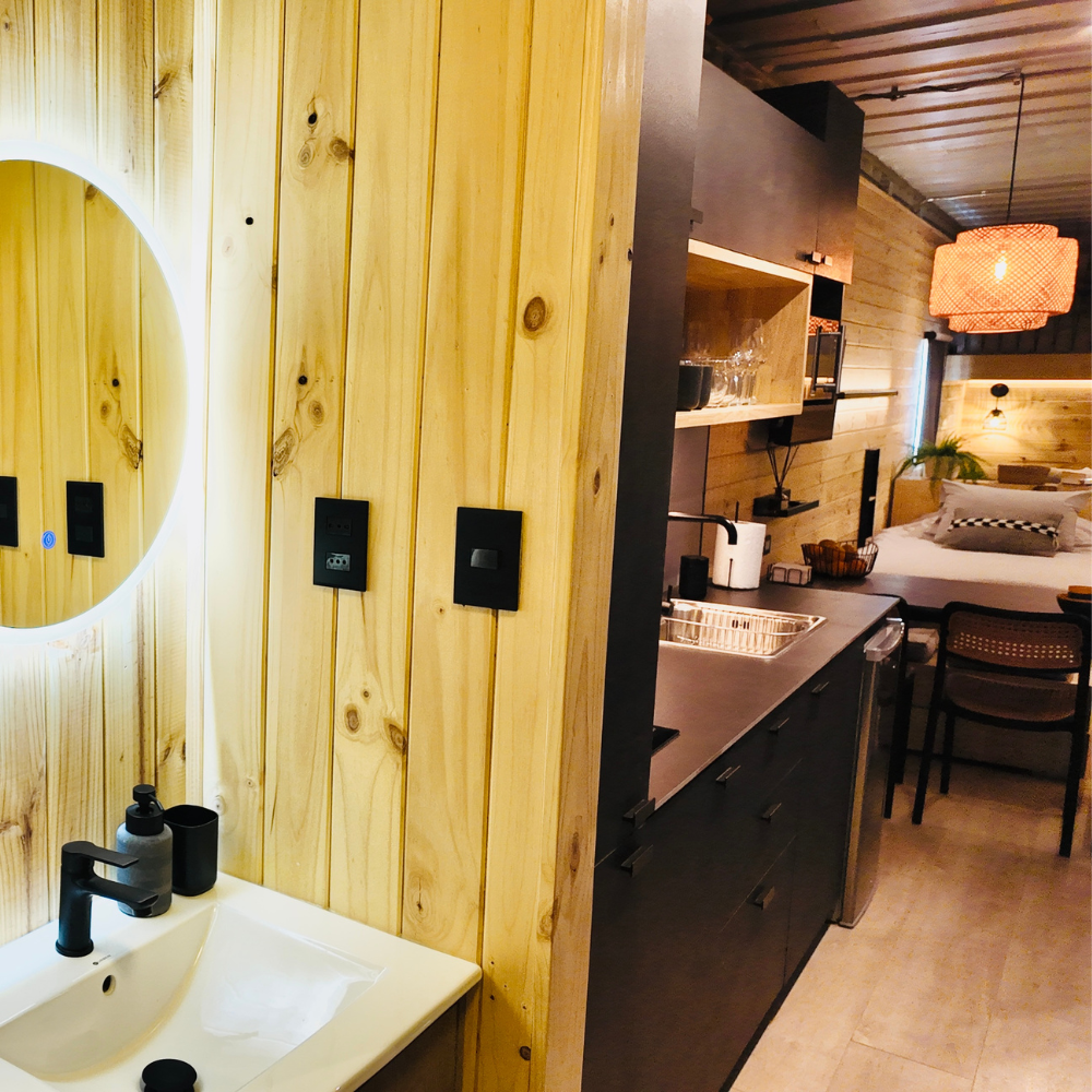 El baño es nuevo y con artefactos de calidad. Cuenta con lavamanos, agua potable fría y caliente, espejo con luz led y toallas para los 4 huéspedes. Además, podrás darte una relajante ducha en un amplio espacio de 70x150 cms con mampara abatible de vidrio, columna de ducha, rejilla y dispensador de shampoo, acondicionador y jabón, todo en color negro.