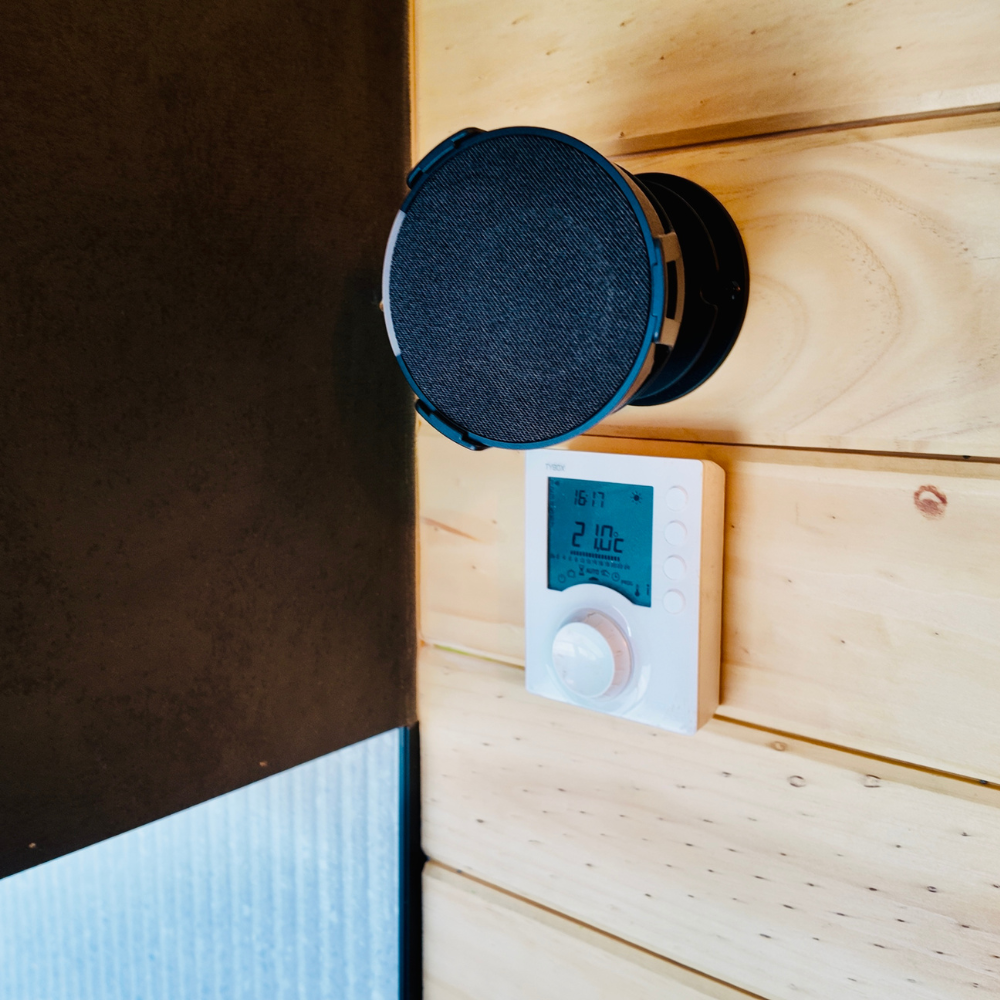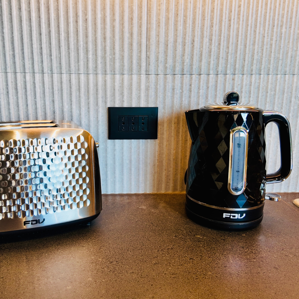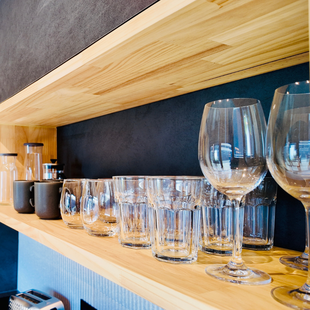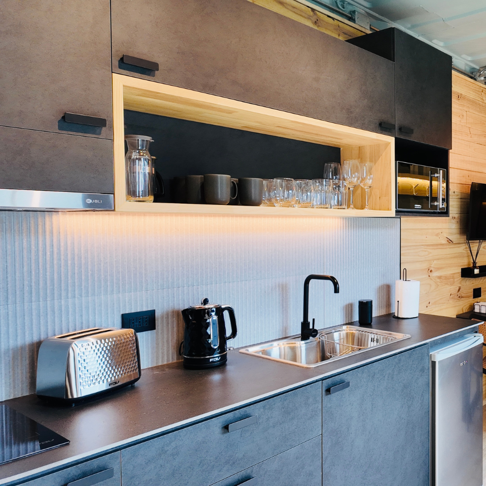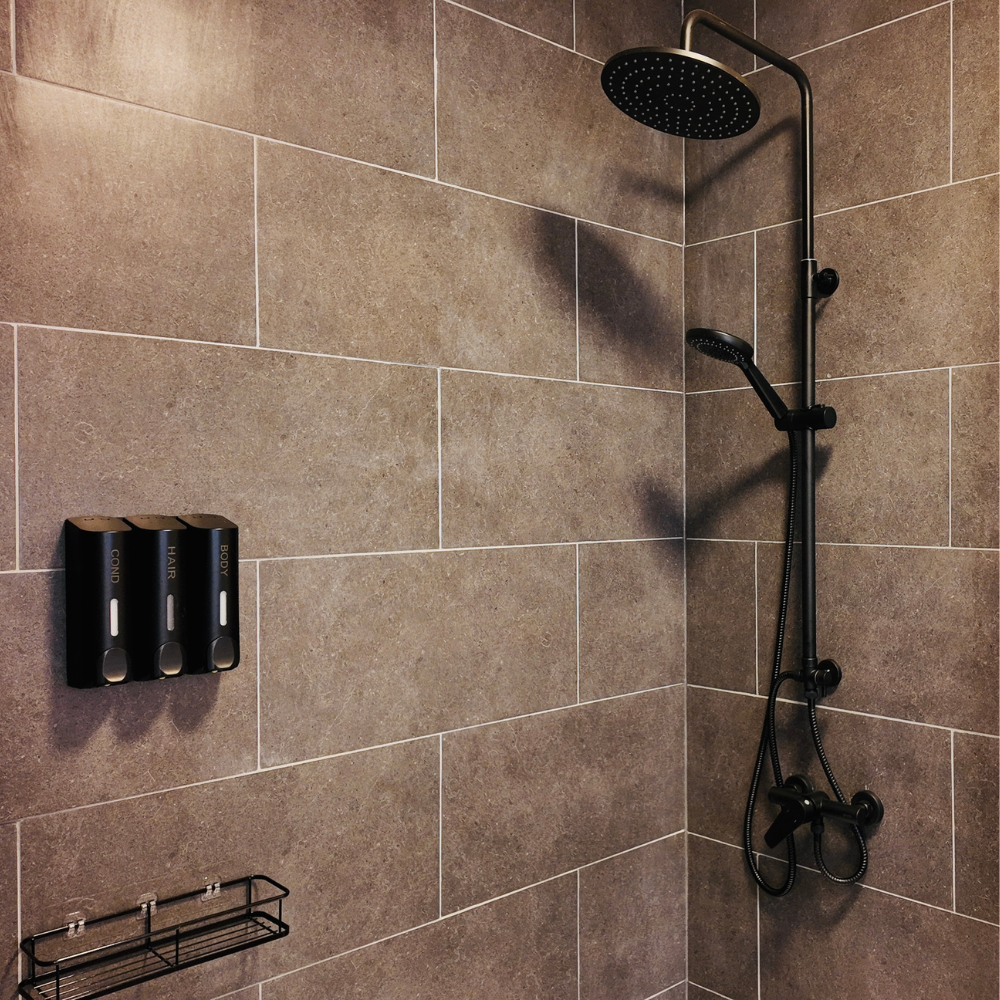 El baño es nuevo y con artefactos de calidad. Cuenta con lavamanos, agua potable fría y caliente, espejo con luz led y toallas para los 4 huéspedes. Además, podrás darte una relajante ducha en un amplio espacio de 70x150 cms con mampara abatible de vidrio, columna de ducha, rejilla y dispensador de shampoo, acondicionador y jabón, todo en color negro.