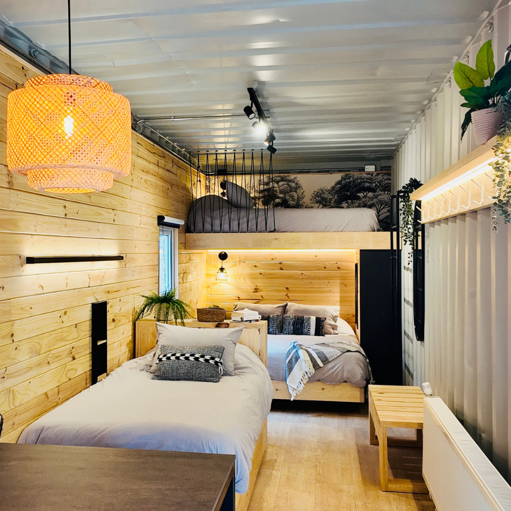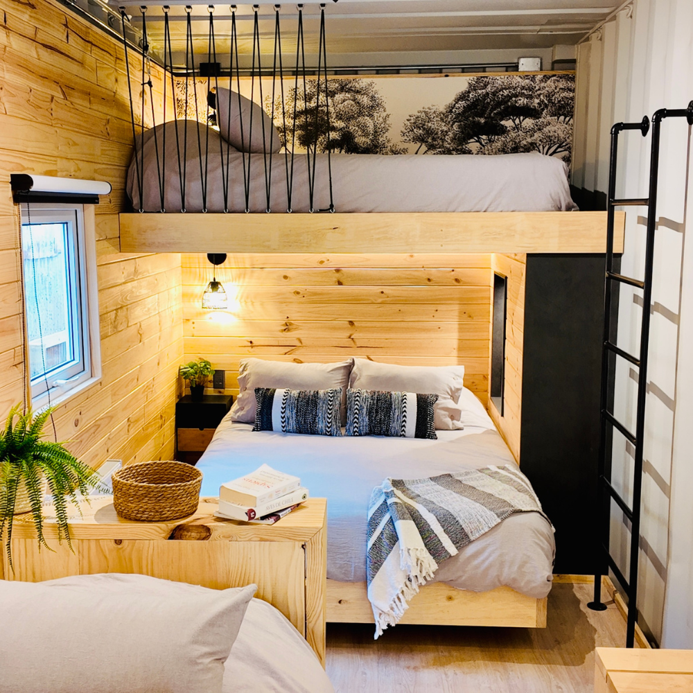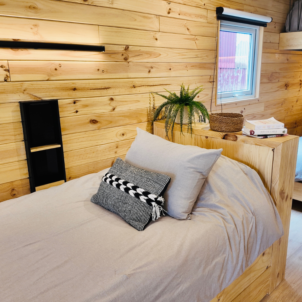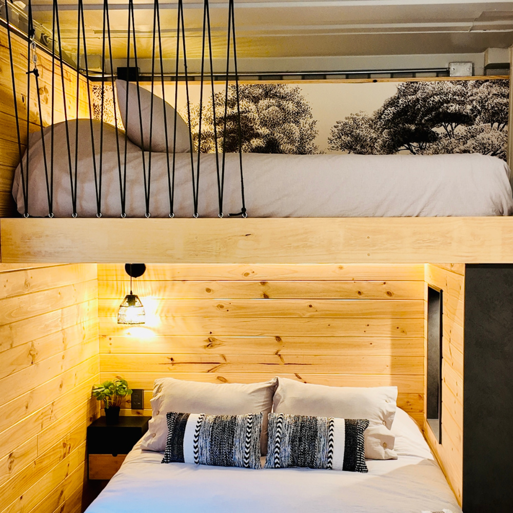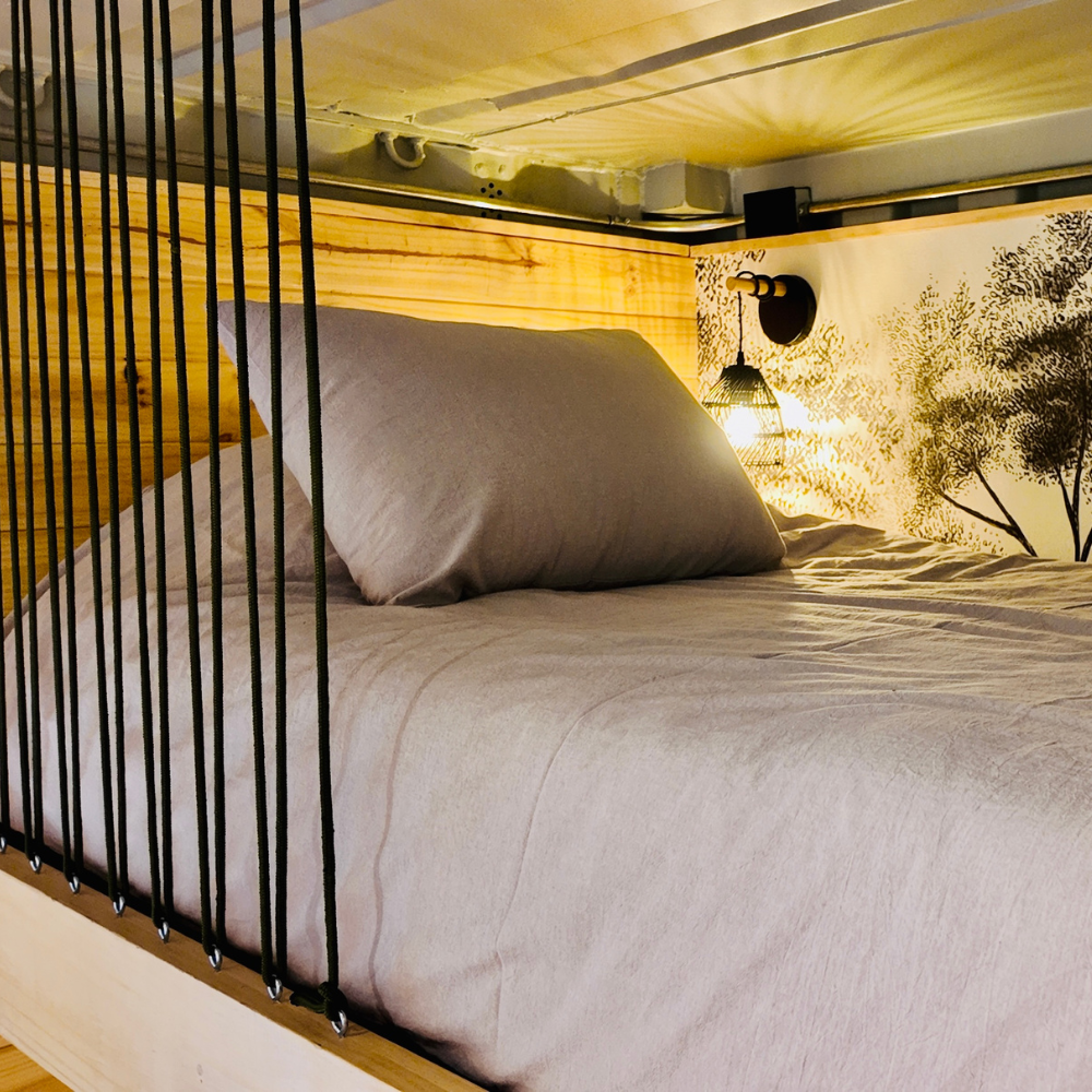 El espacio cuenta con 1 cama de 1 ½ plaza con almacenaje debajo de ella. Otra cama de 2 plazas y 1 colchón de 1 ½ plaza en un camarote superior al cual se accede por una escalera de fierro.