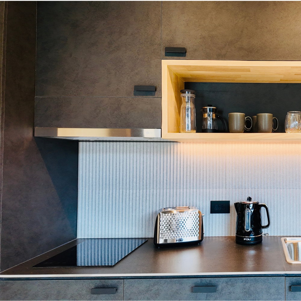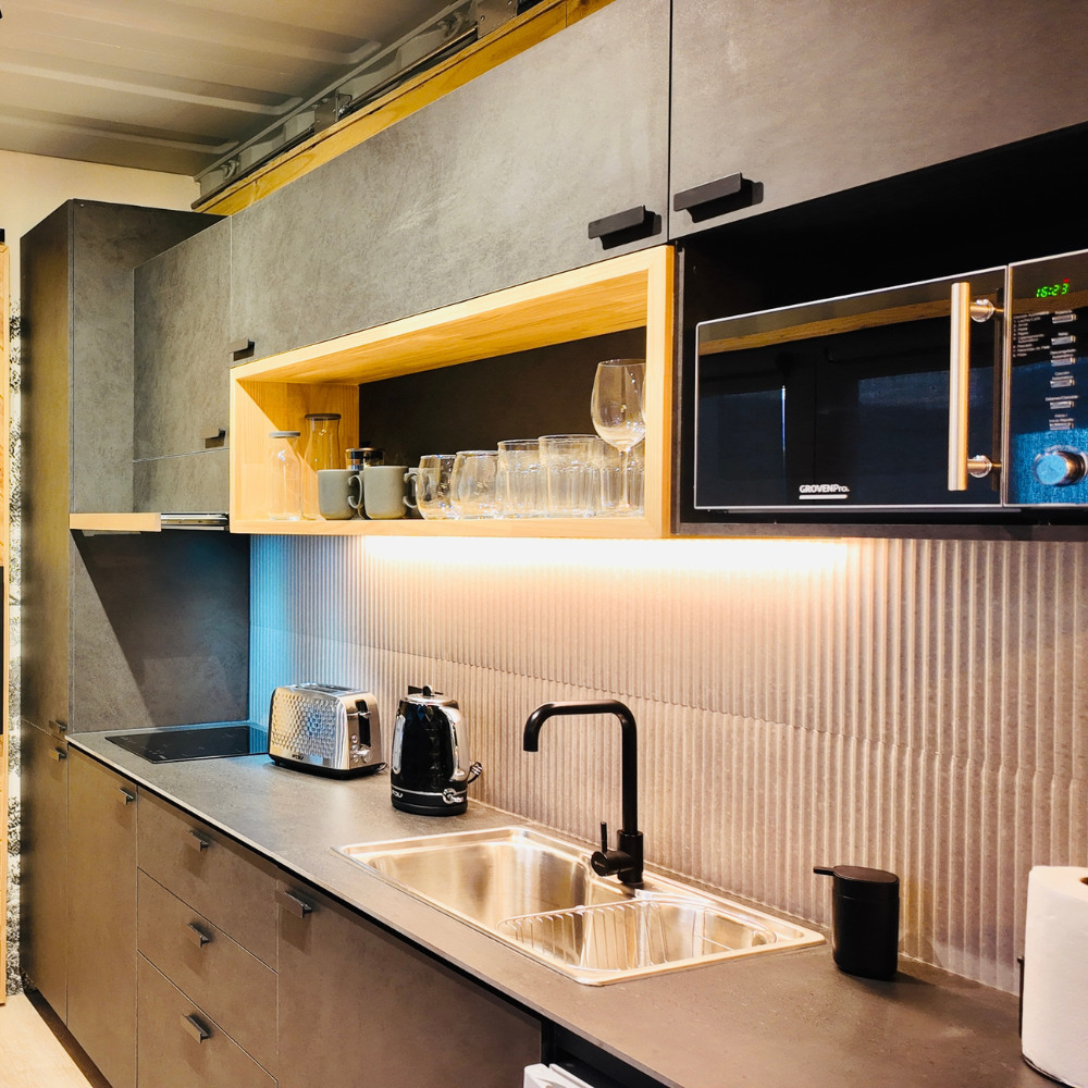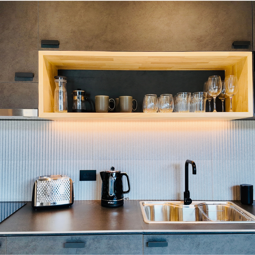 La cocina está completamente equipada. Cuenta con Frigobar, microondas, encimera vitrocerámica, campana de extracción hervidor, tostador, vajilla para 6 personas, secaplatos, ollas, sartenes, y artículos indispensables como sal, azúcar, aceite, etc.